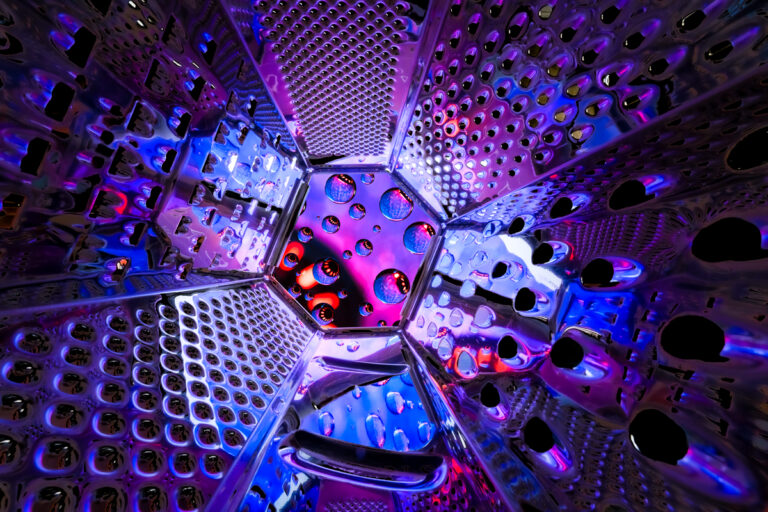 Each water droplet above the subject on the upper glass stage becomes a little lens, imaging whatever is below. The result is we get sharply defined images of the silhouetted sink strainer in the water drops, but the shape of the sink strainer itself is just out of focus enough to leave you guessing, which is kind of the point.